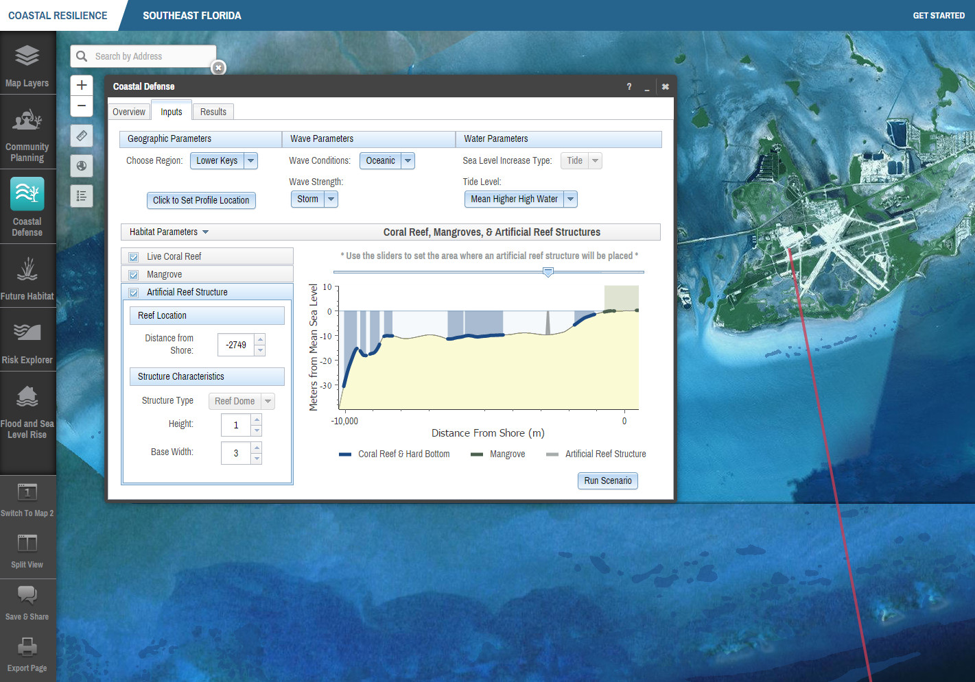 The Coastal Resilience decision support system includes a visualization platform where ecological, social, and economic information can be viewed alongside sea level rise and storm surge scenarios in specific geographies. In addition, a modular, configurable plugin architecture allows specific geographies to have apps designed specifically for geo-processing and display. These cater to the needs of stakeholders, policies and planning processes. Apps are used to simplify complex relationships or models, convey a specific ecological or social concept, or used to compare different future condition scenarios.