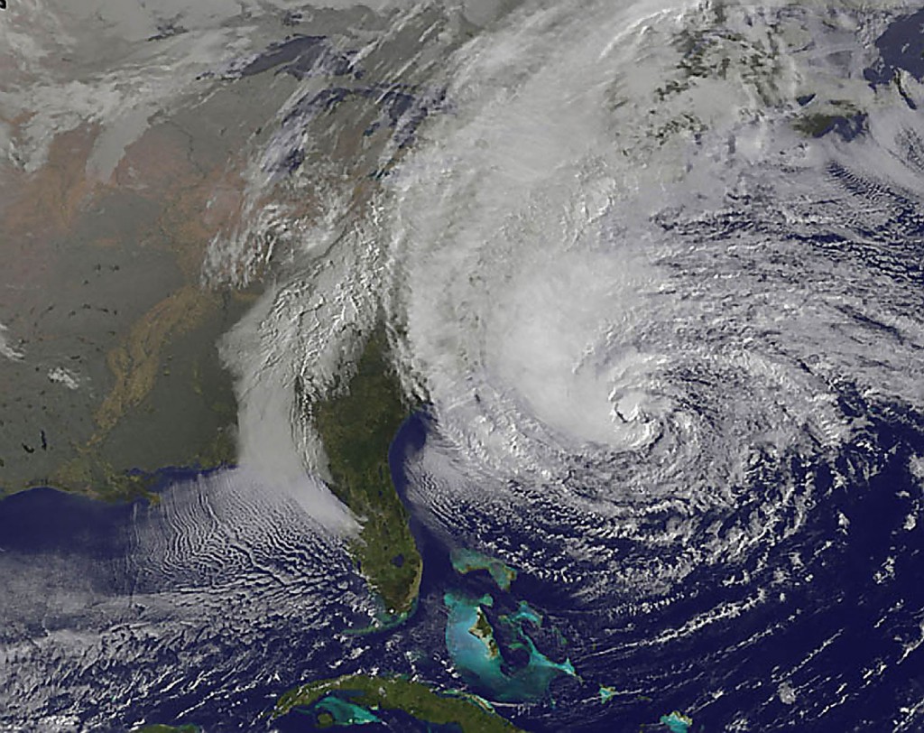 Satellite image of Hurrican Sandy approaching the east coast of the United States. Hurricane Sandy was a hurricane that devastated portions of the Caribbean and the Mid-Atlantic and Northeastern United States during late October 2012. Sandy, classified as the eighteenth named storm and tenth hurricane of the 2012 Atlantic hurricane season, was a Category 2 storm at its peak intensity. While it was a Category 1 storm off the coast of the Northeastern United States, the storm became the largest Atlantic hurricane on record (as measured by diameter, with winds spanning 1,100 miles (1,800 km). Photo credit: NASA