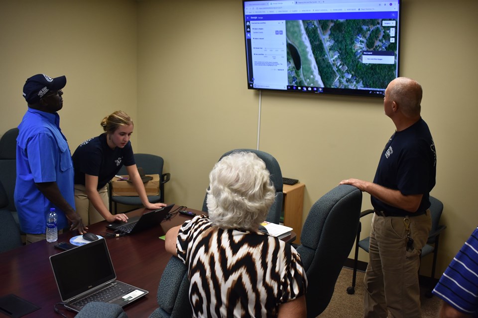 Members of the public use the Flood Risk App to view their neighborhoods at the Camden County EOC Open House    Photo credit to Camden County Emergency Management Agency