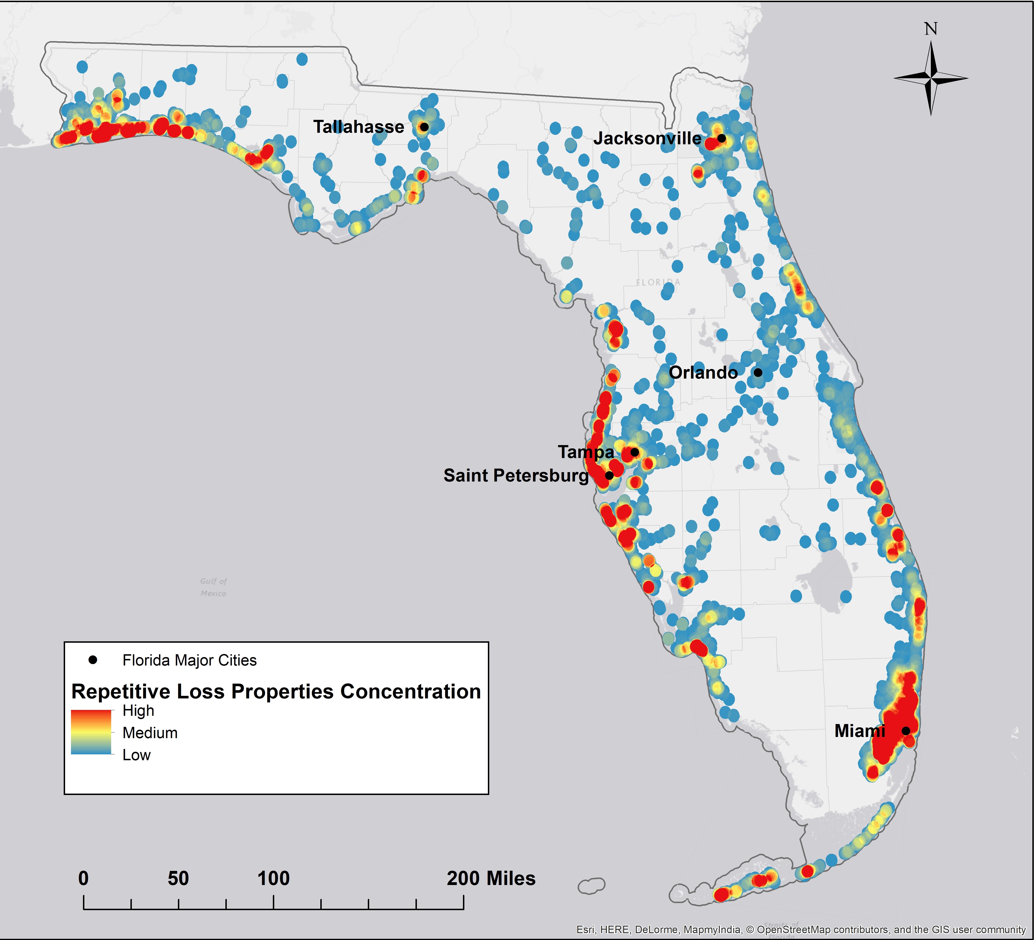 The study also shows the location of more than 15,000 repetitive loss properties in Florida, which, collectively, filed more than 40,000 claims against the National Flood Insurance Program (NFIP), between 1978 and 2011 – more than 1,200 claims per year, on average. As of March of 2016, the National Flood Insurance Program, which is up for reauthorization in 2017, owed the U.S. Treasury $23 Billion.
