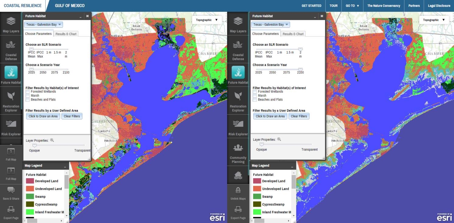The Future Habitat application evaluates where coastal habitats might move inland due to rising sea levels.