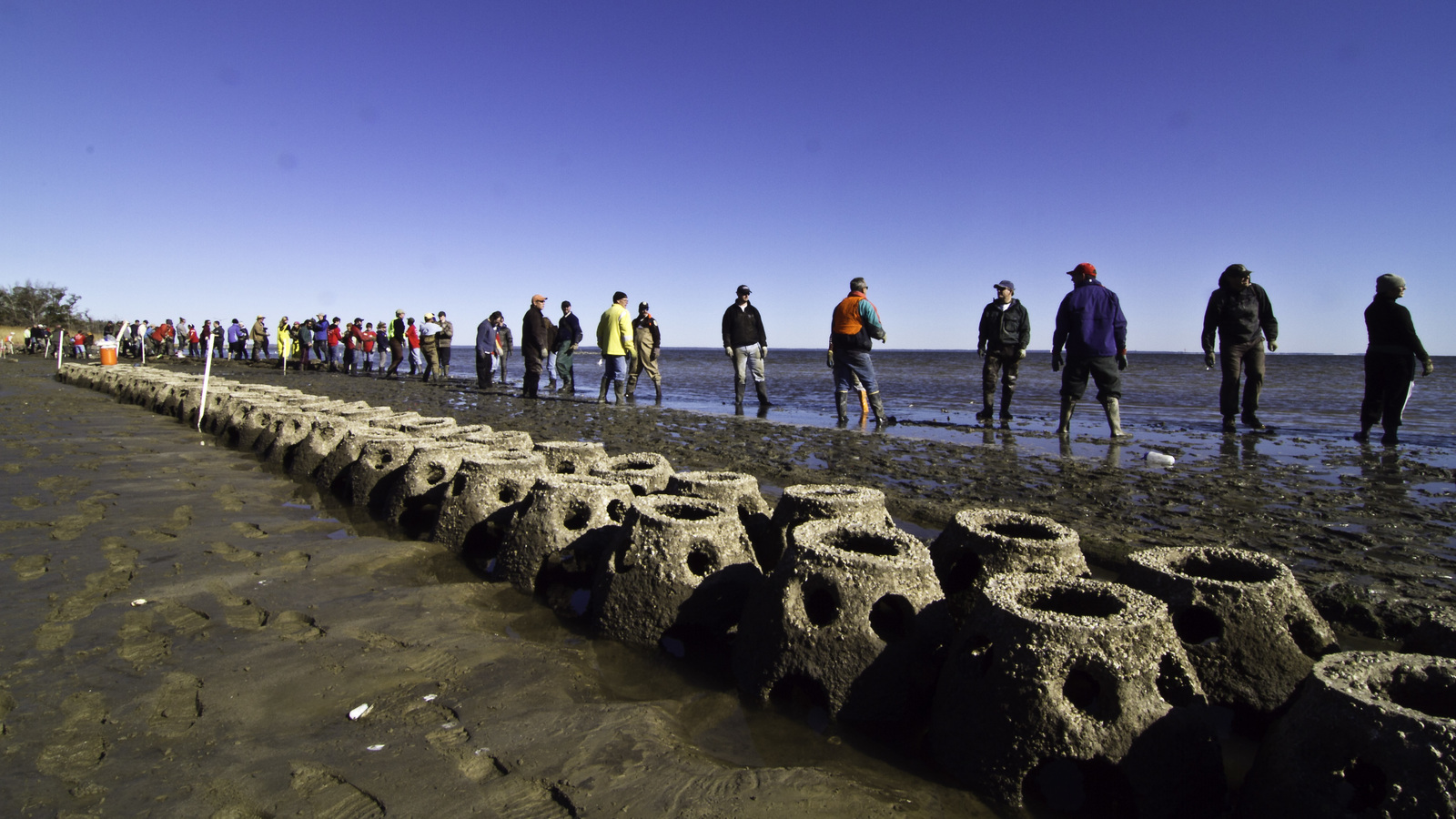 Artificial oyster reef built to restore the oyster population and protective oyster reefs in Mobile Bay, Alabama. Photo Credit: Ami Vitale