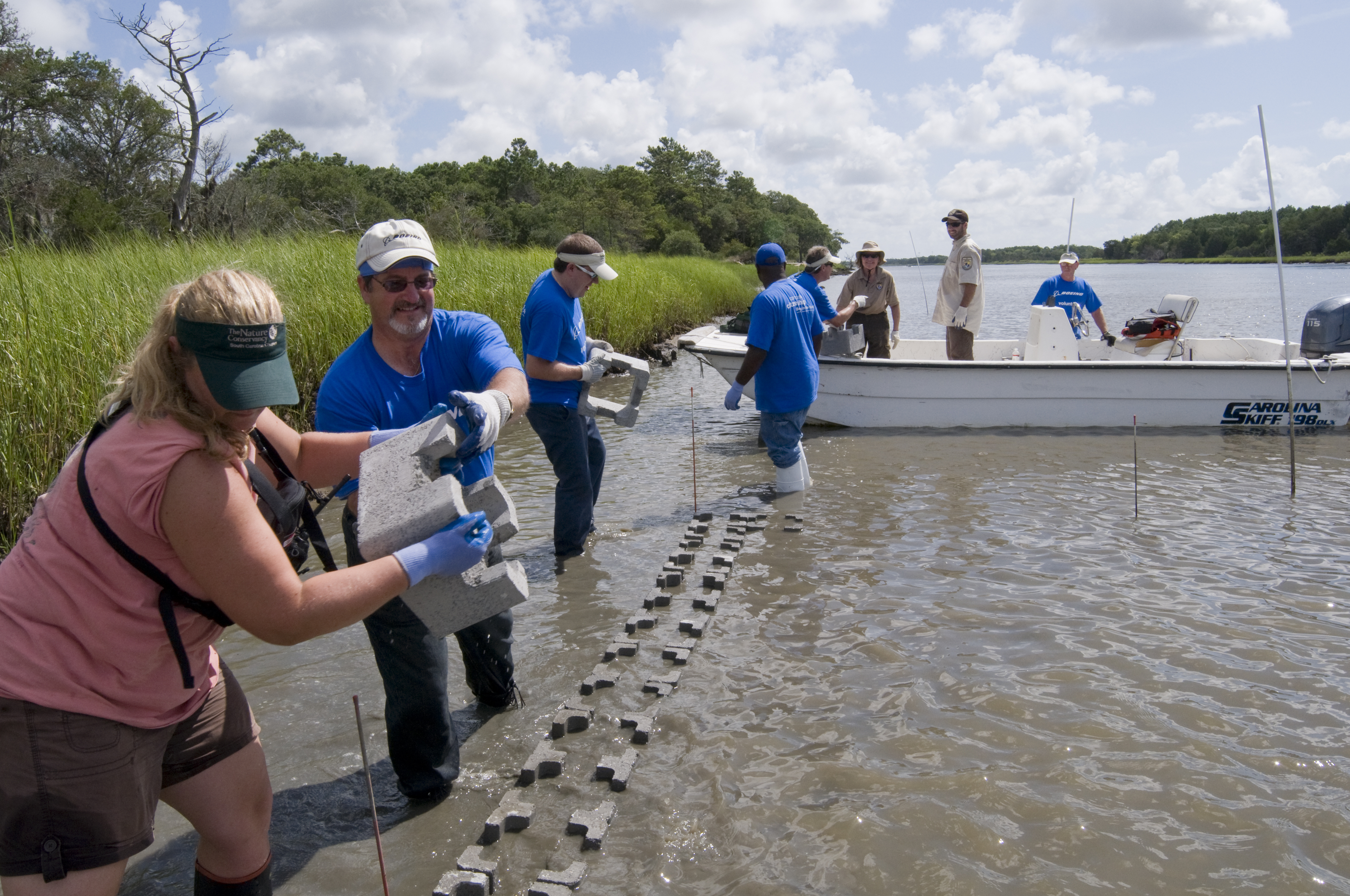 Employees from Boeing and The Nature Conservancy build a new Oyster Castle reef on along the Intracoastal Waterway in McClellanville, SC.