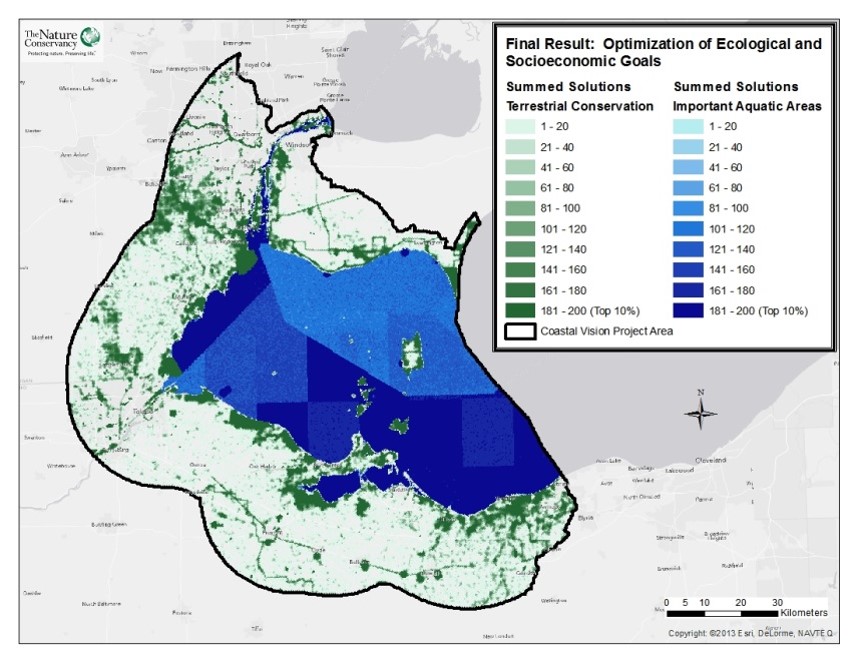 Western Lake Erie Coastal Conservation Vision Mapping: The Western Lake Erie Coastal Conservation Vision mapping identifies where to work to achieve the ecological goals identified in the LEBCS and enhance human well-being targets. The cost required to meet these integrated goals was also estimated. From concept development to final outputs, this work benefited from suggestions and data provided by practitioners and researchers in Michigan, Ohio and Ontario. Employing the spatial conservation planning software, Marxan with Zones, in an innovative manner, the Vision identifies optimal areas to achieve ecological goals and benefit human well-being at the lowest socioeconomic cost. Detailed methods for the analysis are available here. The most important areas for coastal conservation on land are located within 3-4 km (2-2.5 mi) of the shoreline, with some areas farther inland. The approach is now being expanded north through the St. Clair-Detroit River System and into Saginaw Bay by the Upper Midwest & Great Lakes Landscape Conservation Cooperative (LLC) Coastal Conservation Working Group.