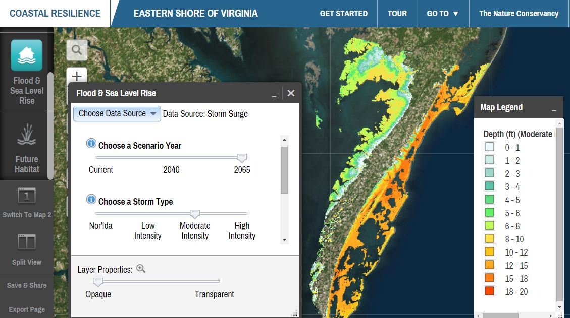 Coastal Resilience for Eastern Shore of Virginia: Screen Shot of the storm surge model in the Flood & Sea Level Rise app.